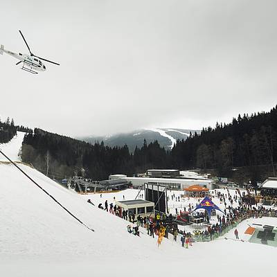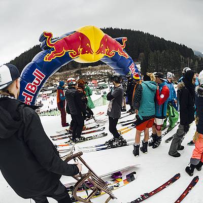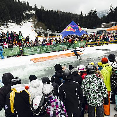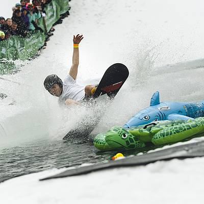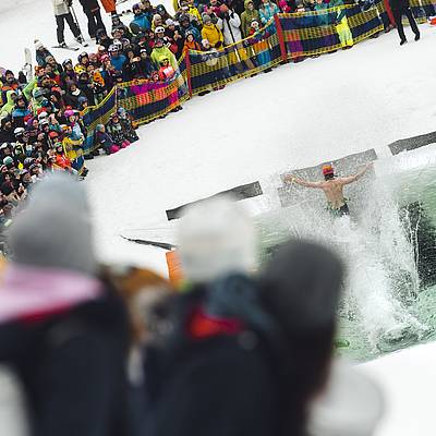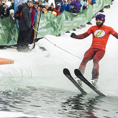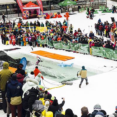 The choice of equipment for crossing the pond is up to you. Whether you choose conventional skis or a snowboard, or whether you opt for a sledge, scooter or snowmobile - there are no limits to your imagination. What's important is the fun and the show for the spectators.
