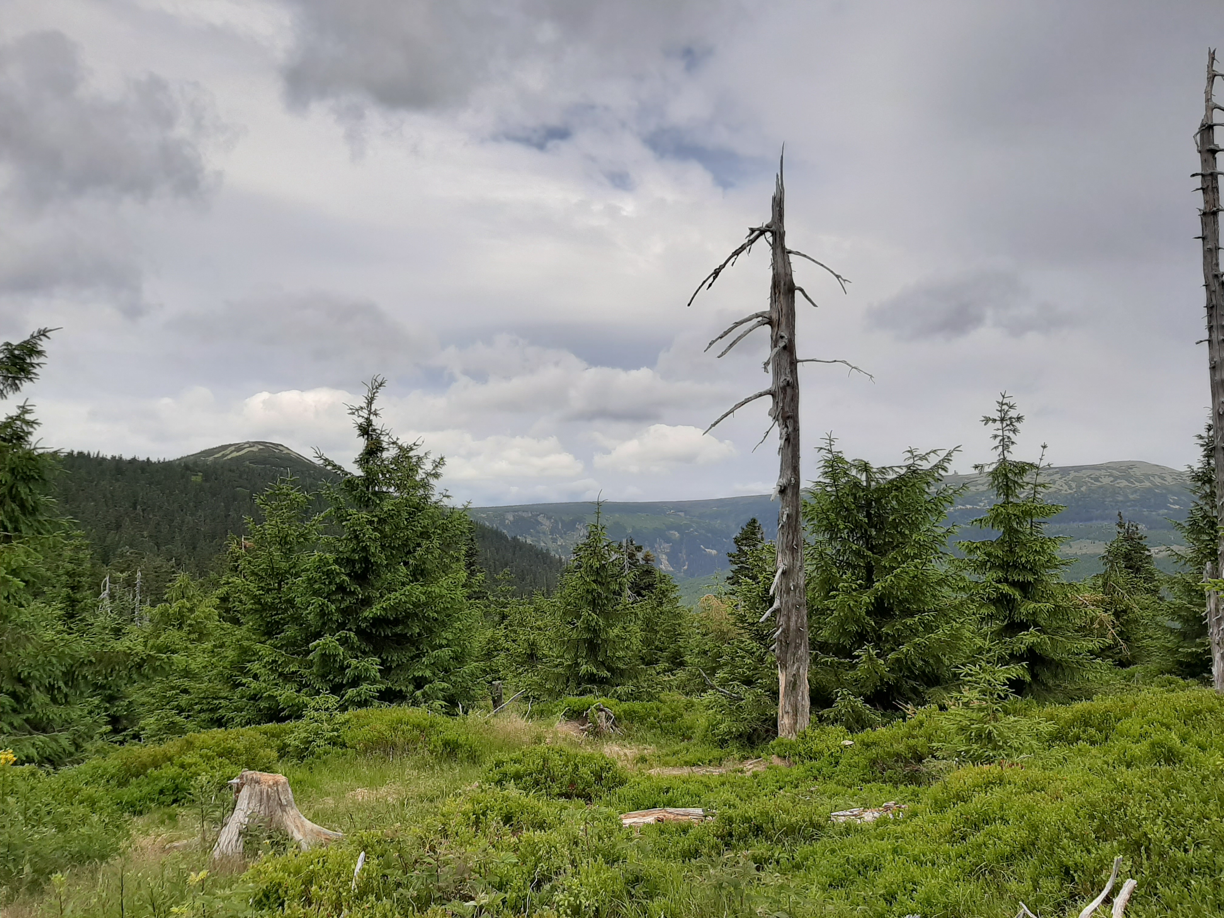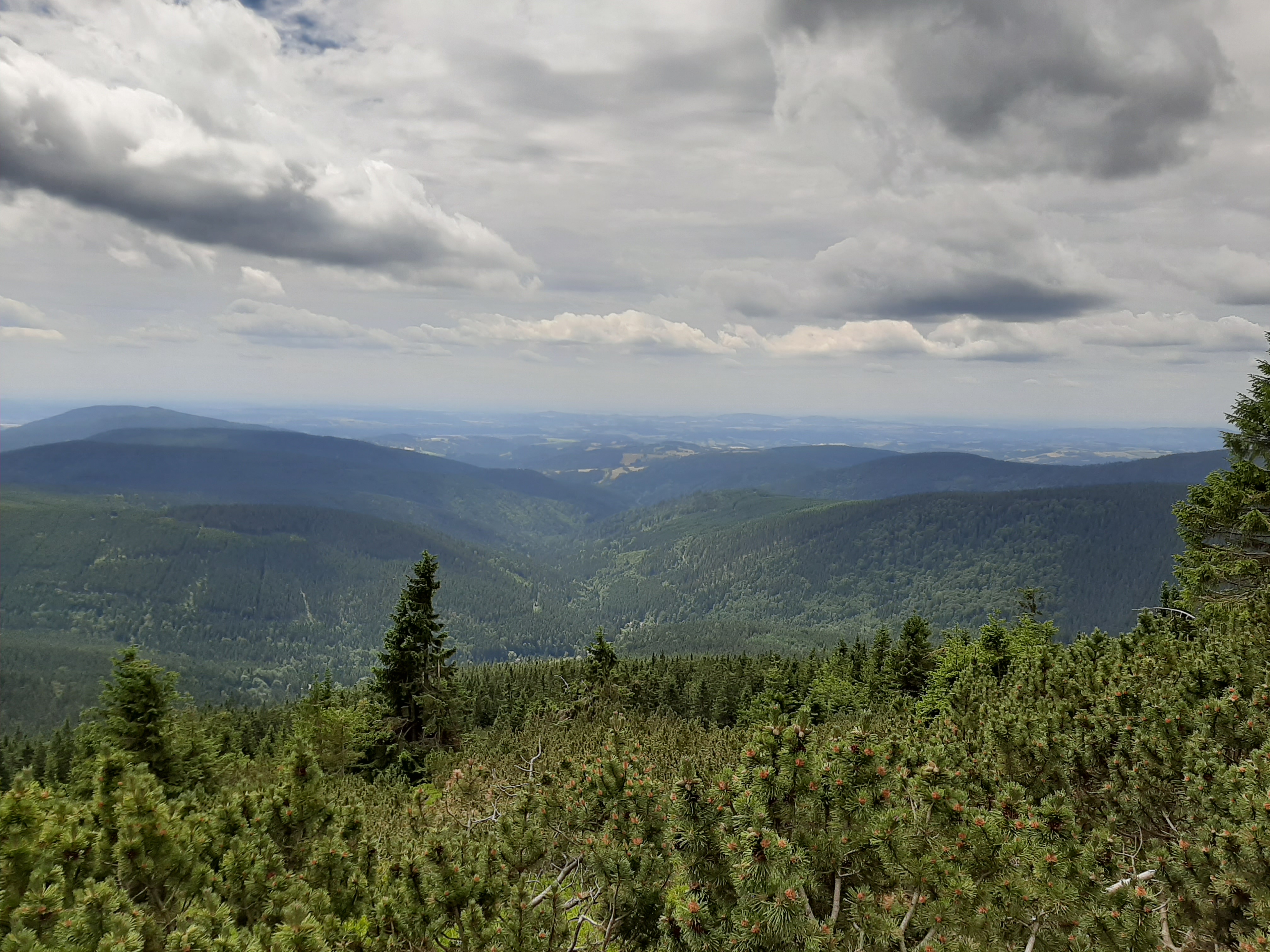 z Vrbatovy boudy se vracíme zpět po Masarykově silnici, při křížení s červenou turistickou stezkou odbočíme směrem na Šmídovu vyhlídku, odkud pokračujeme stále po červené zpět na Medvědín