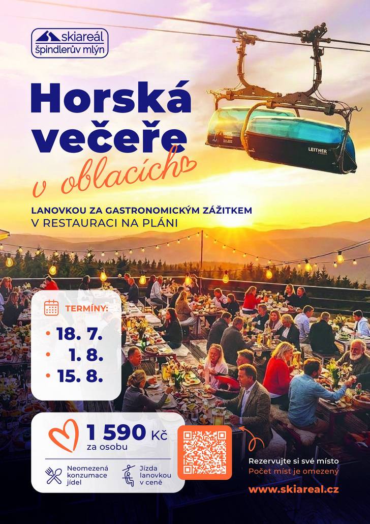 Zažijte jedinečnou atmosféru Horské večeře v oblacích při západu slunce na hřebenech Krkonoš. Nechte se vyvézt večerní lanovkou do panoramatické Restaurace Na Pláni (1 198 m n. m.) a užijte si jedinečnou kombinaci skvělého jídla, živé hudby a dechberoucích výhledů na údolí Špindlerova Mlýna. Čeká vás bohaté grilování ve stylu „all you can eat", kde si vychutnáte neomezené množství grilovaných specialit. Čeká vás příjemná atmosféra pod širým nebem doplněná hudebním programem. Romantickou kulisu večera dotváří západ slunce a horské panorama, na které jen tak nezapomenete.