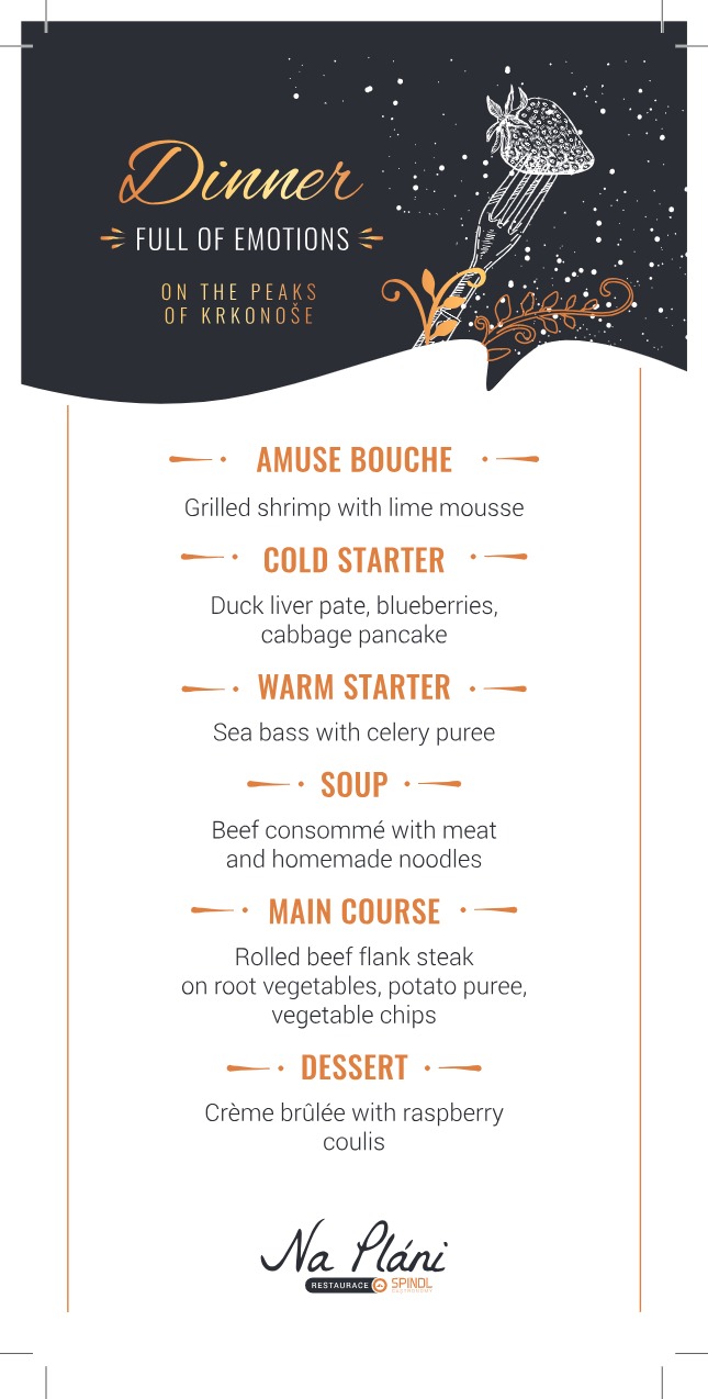 Vychutnejte si 5 chodové degustační menu či bohatý raut v horské restauraci s výhledem na noční Špindlerův Mlýn.